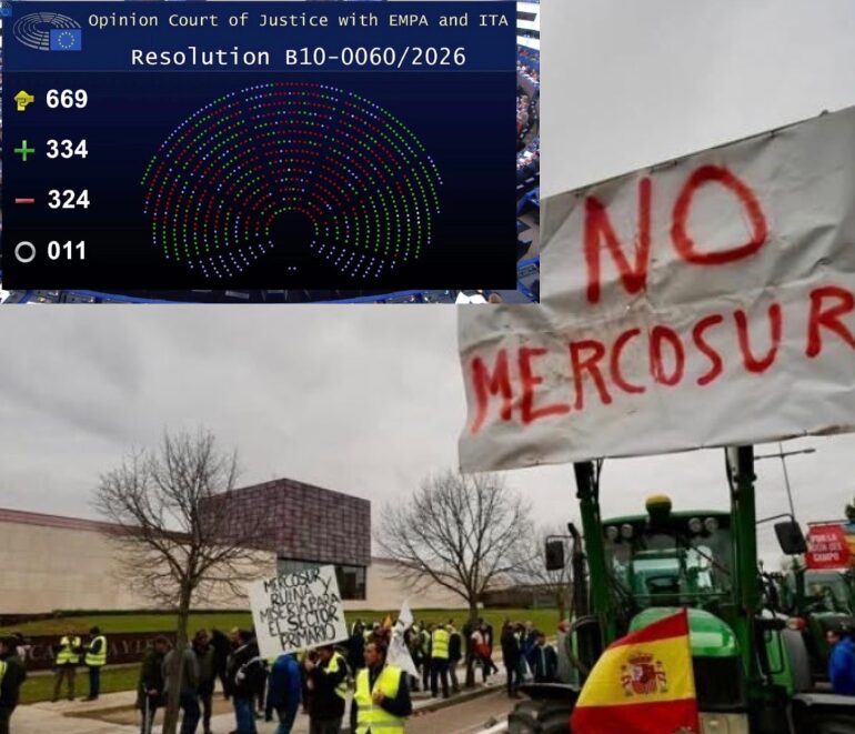 El acuerdo comercial entre la Unión Europea y Mercosur vuelve a quedar en el aire. El Parlamento Europeo ha decidido remitir el texto al Tribunal de Justicia de la UE (TJUE) para que evalúe su compatibilidad con los tratados comunitarios, un movimiento que en la práctica congela la tramitación del pacto durante al menos 18 a 24 meses. La noticia llega en un momento especialmente sensible: mientras agricultores y ganaderos llevan días movilizándose en Galicia contra el tratado y otras políticas que consideran lesivas para el sector, la Eurocámara opta por ganar tiempo y poner el acuerdo bajo lupa jurídica.
