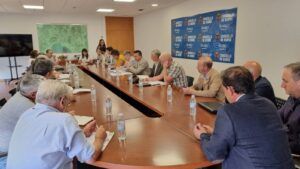 Boiro (A Coruña), 16 de septiembre de 2022.- El conselleiro del Medio Rural, José González, acompañado por el director general de Planificación y Ordenación Forestal, José Luis Chan, mantuvo hoy un encuentro con los responsables de las diversas comunidades de montes del Barbanza, para evaluar la situación tras los incendios forestales registrados este verano en la zona y las medidas tomadas hasta ahora.