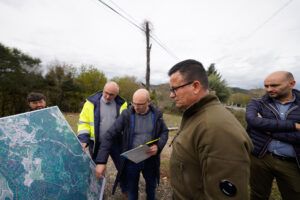 Creciente (Pontevedra), 16 de marzo de 2023.- El conselleiro del Medio Rural, José González, acompañado de la directora general de la Agencia Gallega de Desarrollo Rural, Inés Santé, y del alcalde de Crecente, Julio César García-Luengo, mantuvo hoy un encuentro informativo con los vecinos que se verán beneficiados por el nuevo polígono agroforestal de Mandelos, en este municipio pontevedrés, para abordar las características y posibilidades que ofrece este instrumento de movilización de tierras. Seguidamente, se desplazó hasta la zona para supervisar los trabajos de desbroce y puesta a punto, también en compañía del delegado territorial de la Xunta en Pontevedra, Luis López.