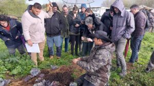 Por su parte, Gandería Roidiz es una granja de larga tradición familiar dedicada, principalmente, a la producción de leche de vacuno. Desde 2017, coincidiendo con la incorporación de una nueva socia, Teresa Molina Santiago (técnica en Paisajismo y Medio Rural y licenciada en Publicidad y RR.PP), hicieron un gran cambio en el sistema productivo apostando por la ecología. Desde este momento, han trabajado para mejorar la calidad de las praderas con labranza cero, únicamente con el pastoreo controlado y aportaciones de las propias deyecciones de los animales. “En estos ocho años de andanza con el modelo regenerativo han sido, y siguen siendo, muchos los retos afrontados, pero con buenos resultados”, explica Teresa. A esta visita acudieron Antonio Tucci y Xan Pouliquen, que hizo una cata del suelo para mostrar in situ el cambio, a mejor, conseguido.