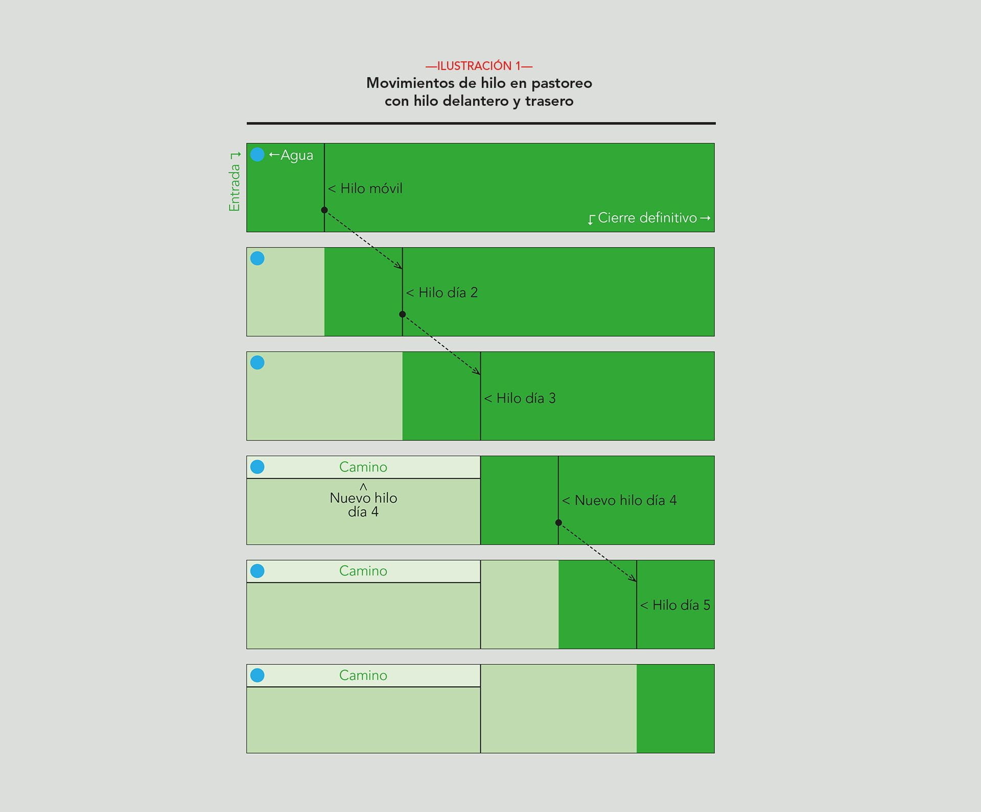 - Con hilo delantero y trasero —Ver Fotografía 5—: El objetivo es cerrar la zona de pasto que los animales comieron anteriormente, en un avance sobre tres días máximo. La Ilustración 1 describe cómo se deben mover los hilos, y habría que destacar varios detalles de este gráfico: 1) El cierre perimetral bien hecho para evitar escapadas a las fincas vecinas, 2) El punto de agua, a no ser que trabajemos con una cisterna que se mueva con los animales, y 3) El tamaño de las parcelas va variando, según lo que cree el ganadero/a que necesitan las vacas.