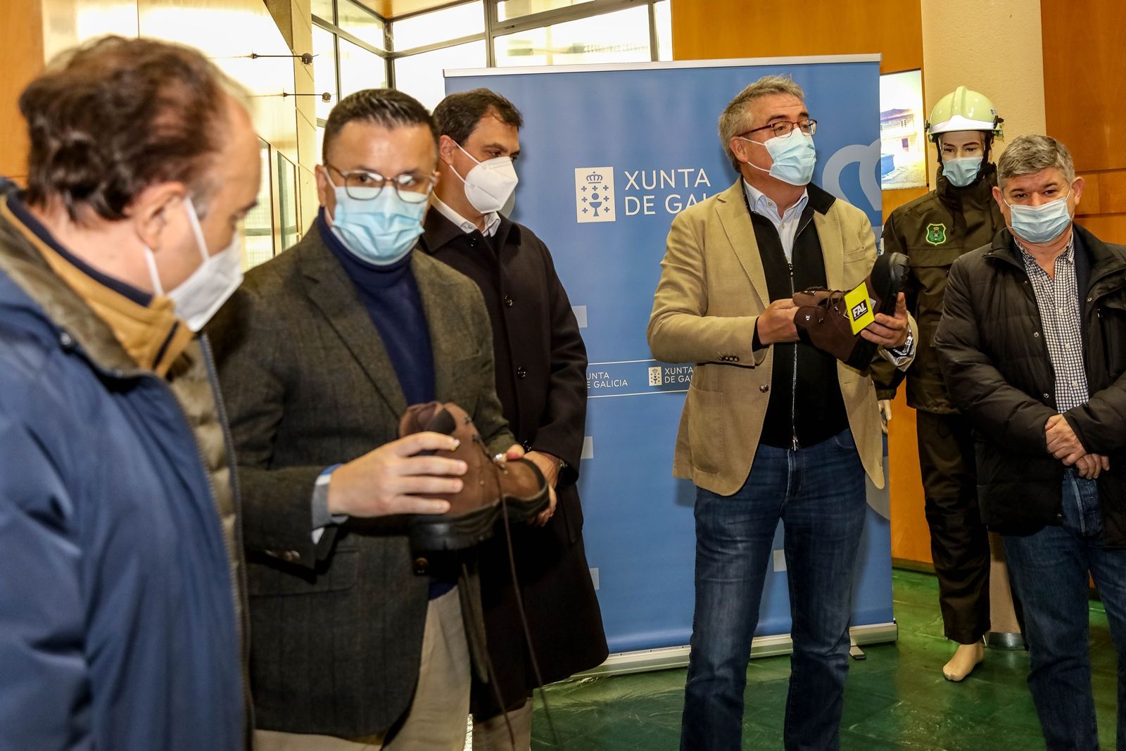 Lalín (Pontevedra), 15 de marzo de 2022.- O conselleiro do Medio Rural, José González, acompañado polo director xeral de Defensa do Monte, Manuel Rodríguez, fixo hoxe entrega en Lalín de roupa para axentes ambientais e técnicos do distrito forestal XVI Deza-Tabeirós. En concreto, facilitóuselles diferente material aos 18 axentes e técnicos desta demarcación, de forma que cada un deles recibiu botas de inverno, anoraks, chaquetas -tanto cortaventos como de verán-, pantalóns -impermeables, de verán e de inverno-, xerseis e polos (de manga longa e curta).