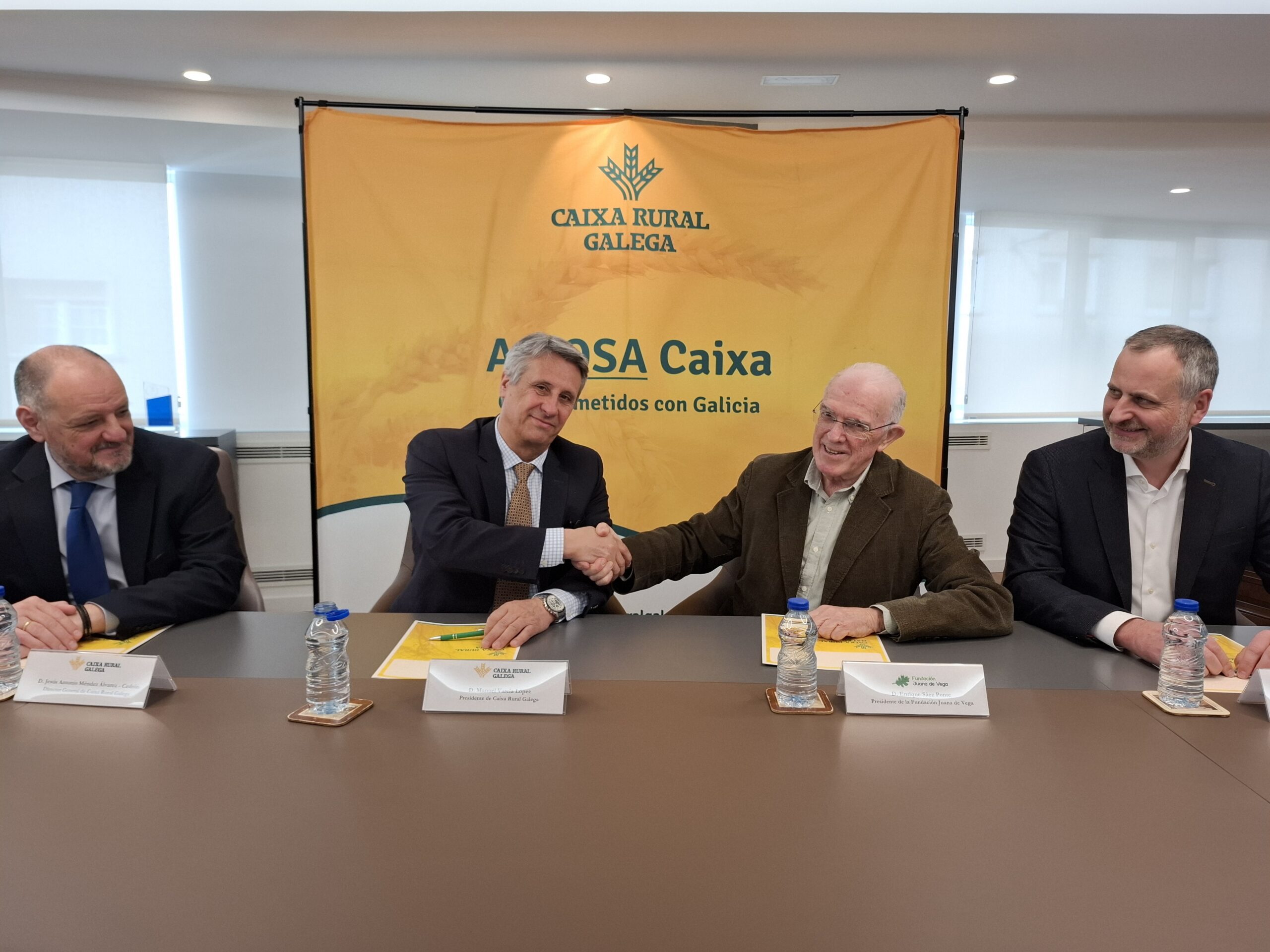 La firma del convenio tuvo lugar en la sede de la cooperativa financiera en Lugo, con la participación de Manuel Varela López, presidente de Caixa Rural Galega, y Enrique Sáez Ponte, presidente de la Fundación Juana de Vega.